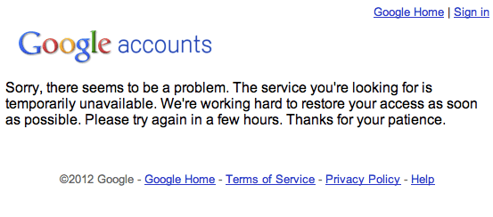 So I carry on with james%adhack.com(at)gtempaccounts.com for my Reader account and a few other Google services. This felt like a small first-world problem for many months but now feels like a Kafkafian purgatory.